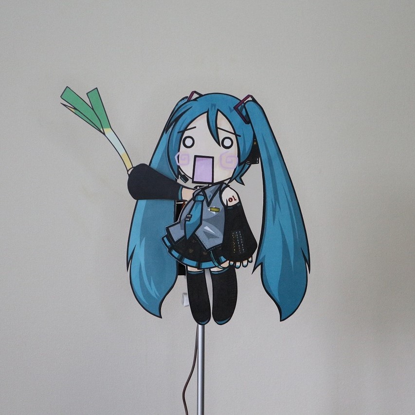☝どこからともなく用意したはちゅねみくのネギ振りイラストを印刷して切り出し、同様に切り出した100均のポリプロピレンボードに張り付けます。