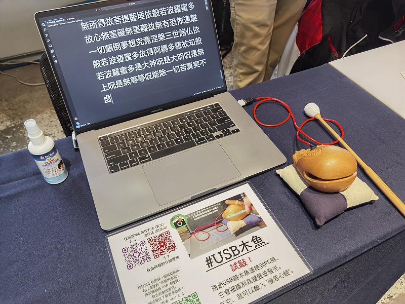 ☝うこさんのUSB木魚です。木魚がUSBキーボードになっていて、ポクポクと叩くと般若心経が入力されます。この発想、天才ですね。とても面白い上に、加速度センサーとコンデンサマイクを組み合わせた入力の仕組みがとても良くできています。