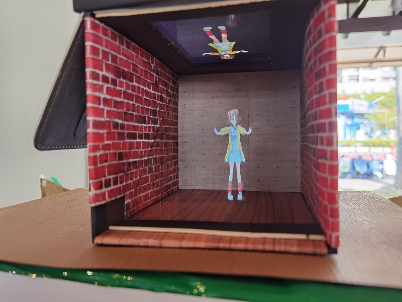 ☝この角度の方が仕組みがわかりやすいですね。斜めに立てかけた透明な板に映像を投影しています。