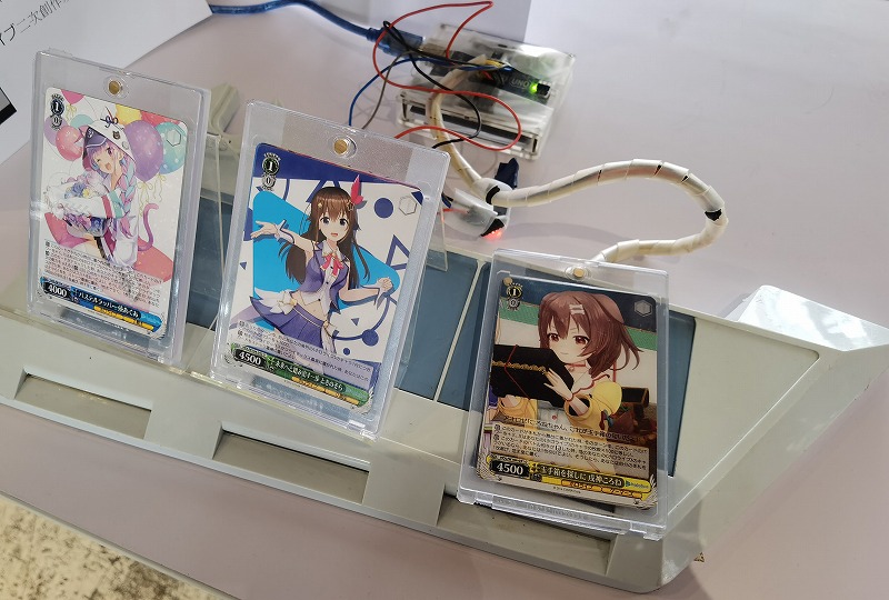 ☝この台(デュエルディスク)の一番右のスロットの下にRFIDリーダーが有り、載せたカードに対応したキャラクターが出現します。ICカードを読み取っている点は私の展示物と共通するところですね。