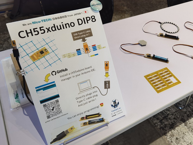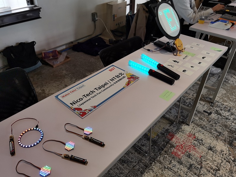 ☝長船さんの展示。すごく小さいマイコンボードを用いた電飾デモを行っていました。このボードはSWITCH SCIENCEで販売中ですが、SWITCH SCIENCEでは台湾への発送は行っていないそうです。