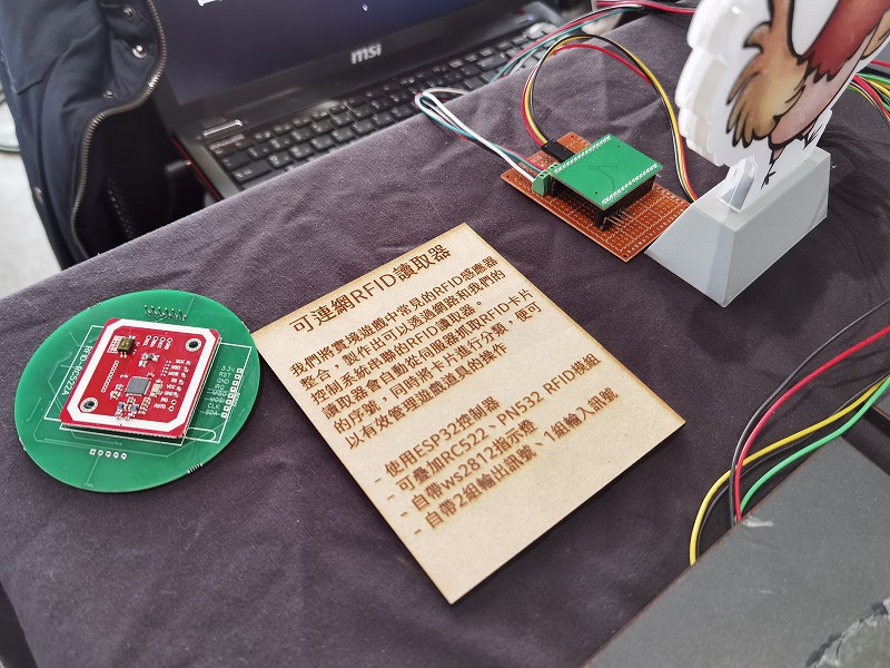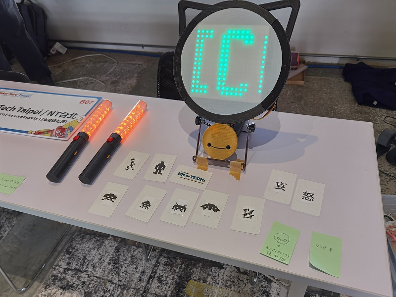 ☝私の展示です。NT金沢2023でも展示していたBLEペンライト(eneloop1本版)と、新作のRFIDカードリーダー付の電光掲示板です。新作は11月に入ってから作り始めたくらい新作なので、まだどこにも情報を整理していないどころか、最終的にどうなるのか作っている本人もわかりません(迷走中)。改良したい。