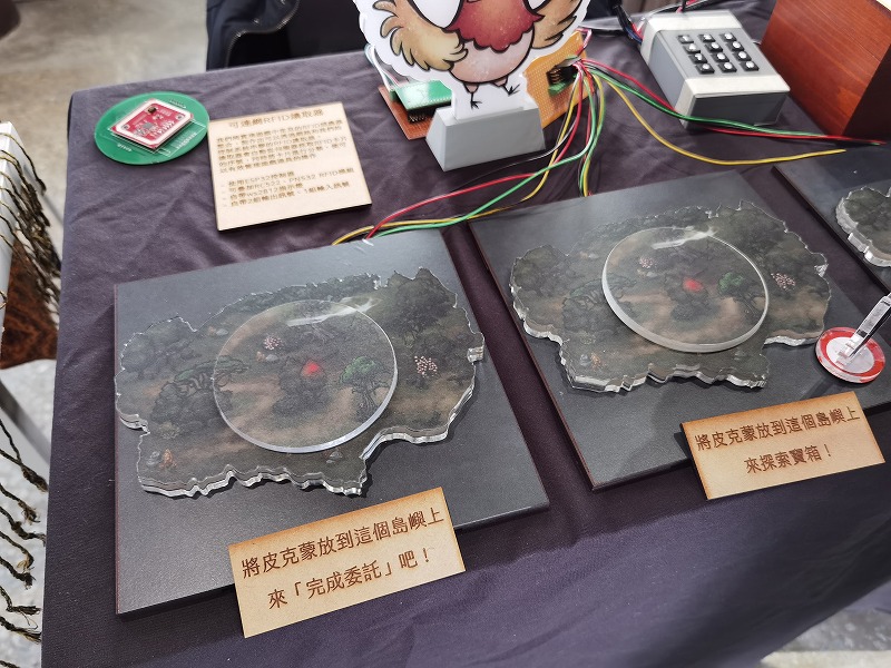☝こちらの展示でもRFIDリーダーが使われています。丸い台の上にICタグ付きのアクリル製の駒(?)を載せると反応します。