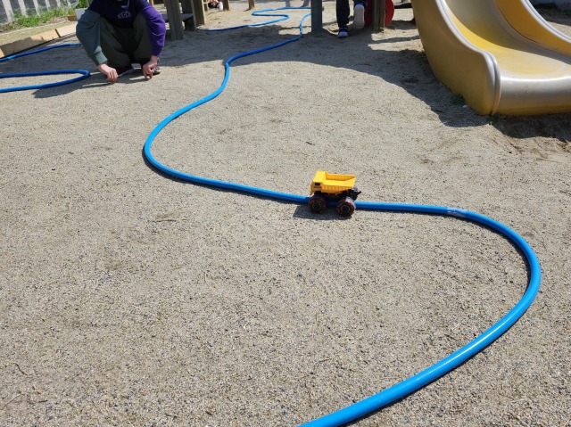☝園庭のミニ四駆サーキット。ワイルドミニ四駆ってホースをレールにして走行できるんですね。