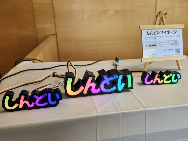 ☝オレ工房さんの「しんどいサイネージ」です。よく見たら大きいのと小さいのでフォントが違う。フルカラーLEDで色々な光らせ方ができるしんどい。ゲーミングしんどい。