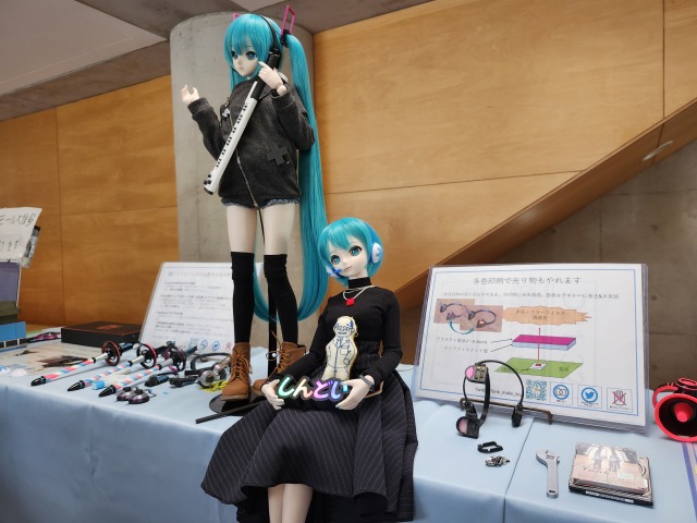 ☝たんくさんの3Dプリンタ作品(と作品を持ったミクさん)等。しんどいサイネージとコラボレーション。他の人の作品と突発的にコラボするのはNT名物で良いですね。